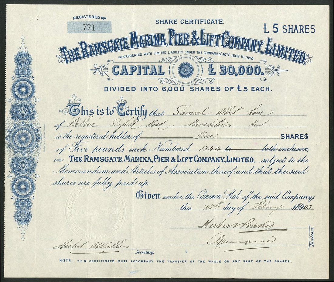Great Britain: Ramsgate Marina, Pier & Lift Co. Ltd., £5 shares, 189[1903], #771, scrollwork left, blue. GVF.