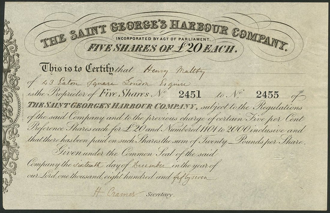 Great Britain: Saint George's Harbour Company, 5 shares of £20, 18[57], #2451-55, scrollwork left, black. NEF.