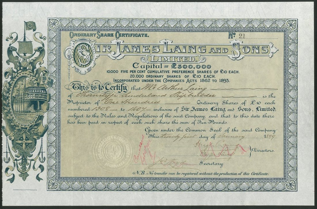 Great Britain: Sir James Laing and Sons Limited, £10 ordinary shares, 1[899], #21, signed by Hugh Laing and Bryan Laing as directors. Bryan was the last and 14th child born in 1875 to Sir James's second wife! Attractive piece with large wooden ship in dry dock, green. Established in Sunderland in 1793 and formed as a Limited Liability company in 1898. Builders of high class passenger liners for companies such as Cunard and P.& O. Also built the first oil tanker for Marcus Samuel of Shell. In difficulty following Sir James's death in 1908 but rescued by Sir James Marr. Became a subsidiary of Sunderland Shipbuilding Dry Docks and Engineering in 1954, eventually passing to Doxford & Sunderland Shipbuilding in 1961. Neatly cancelled, EF.
