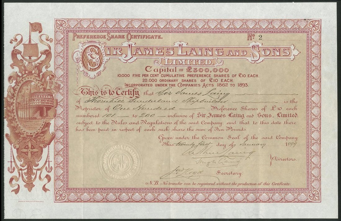 Great Britain: Sir James Laing and Sons Limited, £10 preference shares, 1[899], #2, signed by Arthur Laing and Hugh Laing as directors, attractive piece with large wooden ship in dry dock, red. Established in Sunderland in 1793 and formed as a Limited Liability company in 1898. Builders of high class passenger liners for companies such as Cunard and P.& O. In difficulty following Sir James's death in 1901 but rescued by Sir James Marr. Became a subsidiary of Sunderland Shipbuilding Dry Docks and Engineering in 1954, eventually passing to Doxford & Sunderland Shipbuilding in 1961. Arthur Laing, 1856-1901, and Hugh Laing, born 1871, sons of Sir James Laing, both directors of several other shipping companies. Hugh was heavily involved with the first oil tanker, built for Marcus Samuel of Shell. Neatly cancelled, EF.