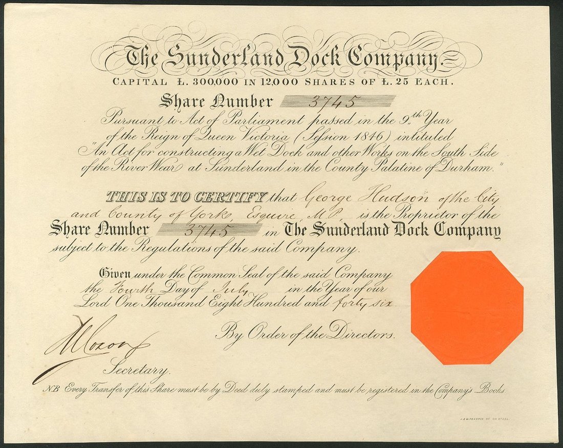 Great Britain: Sunderland Dock Company, £25 share, 18[46], #3745, issued to railway magnate George Hudson, black, orange paper seal. Formed with Hudson at its head, the company built the South Dock, opened in 1850. Also built a colliery railway connecting the mines of Durham with the port. Hudson was elected MP for Sunderland in 1845. EF.