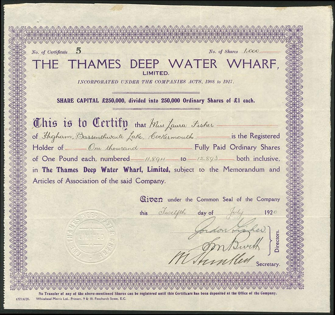 Great Britain: Thames Deep Water Wharf Ltd., £1 shares, 192[0], #5, ornate border, mauve. One of the schemes to build a deep water dock at Canvey Island in Kent. This was later to become Northfleet Deep Water Wharf. GVF and scarce.