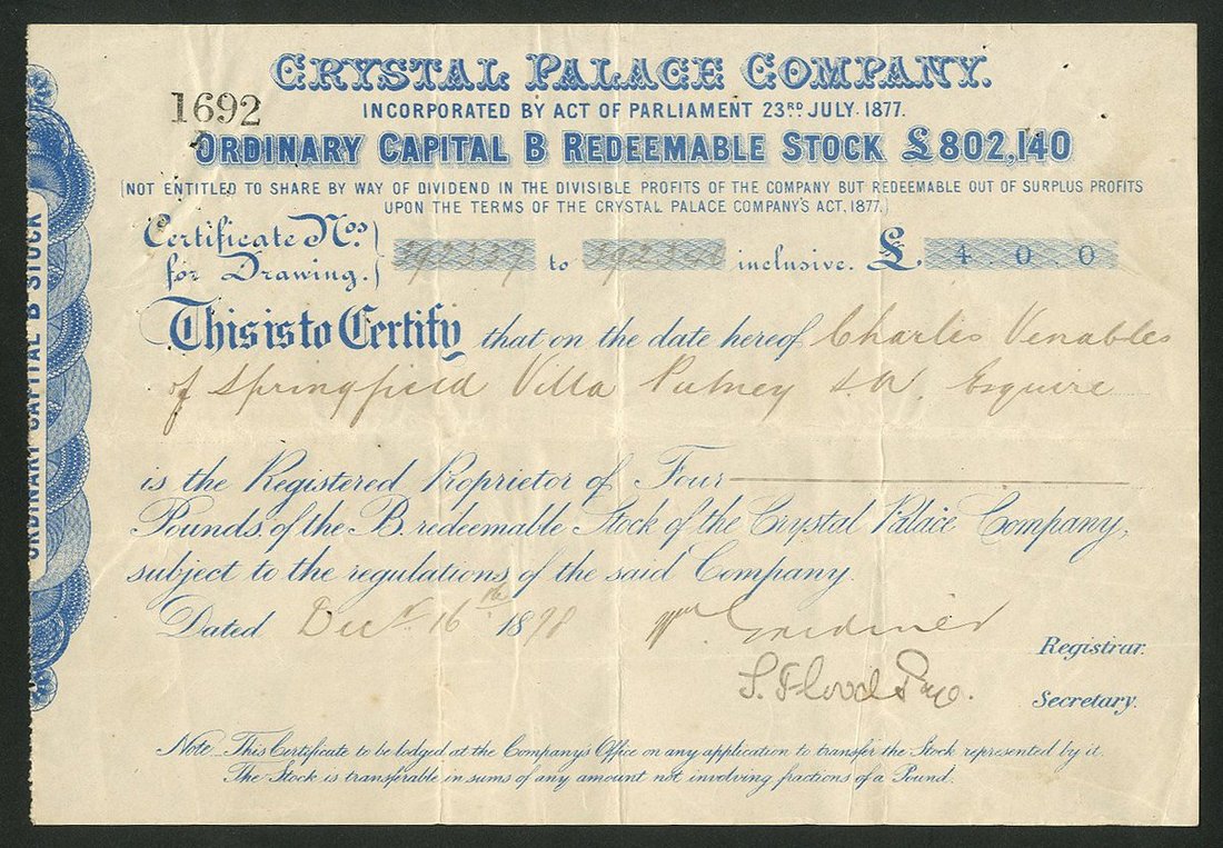 Great Britain: Crystal Palace Company, £4 ordinary capital B redeemebale stock, 18[78], #1692, blue. VF and rare.