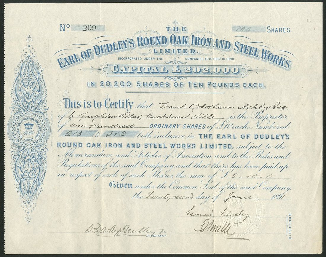 Great Britain: Earl of Dudley's Round Oak Iron and Steel Works Limited, £10 shares, 189[1], #209, blue. The works were founded at Brierley Hill, West Midlands by Lord Ward in 1857, making pig iron. Lord Ward was create the 1st Earl of Dudley in 1860. By the 1890's the works turned to steel production and this company was formed, employing thousands of men. The company was in liquidation by 1894 after some financial problems but was reformed in 1897 as the Earl of Dudley's Round Oak Works Limited. The works carried on through to the 1950's and 60's when it was nationalised and privatised and renationalised and was finally closed in 1982. GVF and rare.