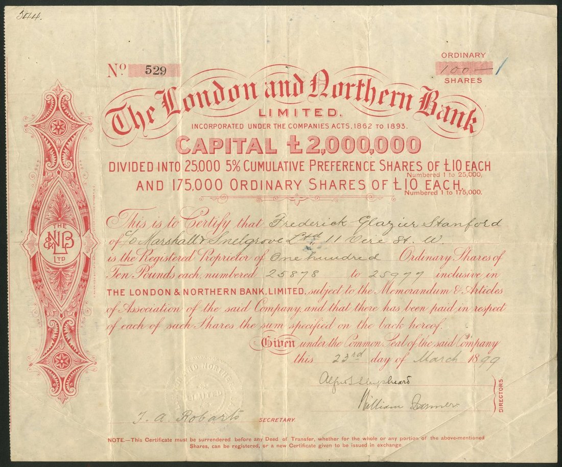 Great Britain: London and Northern Bank Limited, £10 ordinary shares, 18[99], #529, scrollwork at left, red. Established in 1898 out of the remains of the Leeds Joint Stock Bank Ltd. Failed in 1899 and most of the business acquired by Bradford District Bank. AVF and scarce.