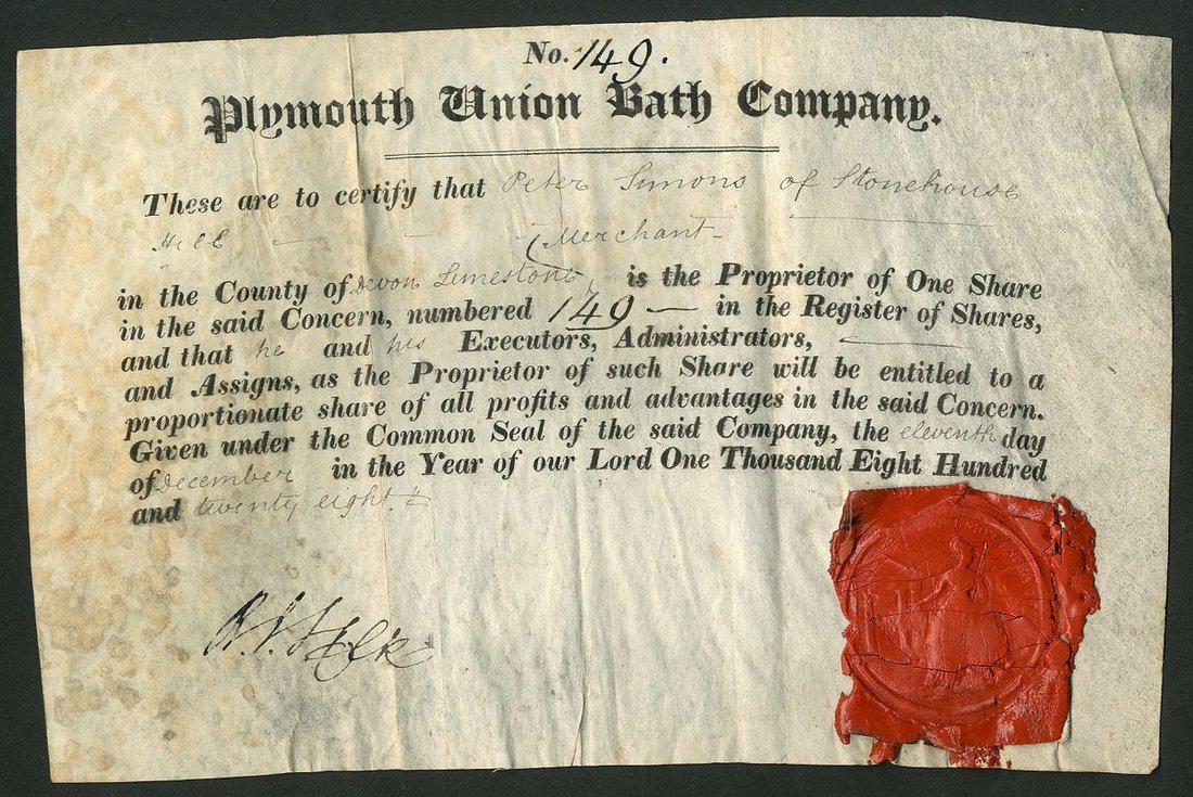 Great Britain: Plymouth Union Bath Company, one share, 18[28], #149, black printing, on vellum, large red wax seal at lower right. Formed by Royal Charter in 1828, the company choosing to add 'Royal' to its name when opened in 1830. The classical building contained several swimming baths, dressing roooms, showers and douche baths. After several successful years of operation the baths were demolished in 1847 because it was in the way of the South Devon Railway terminus being built at Millbay. Vellum a little crinkled otherwise VF and rare. First time seen.