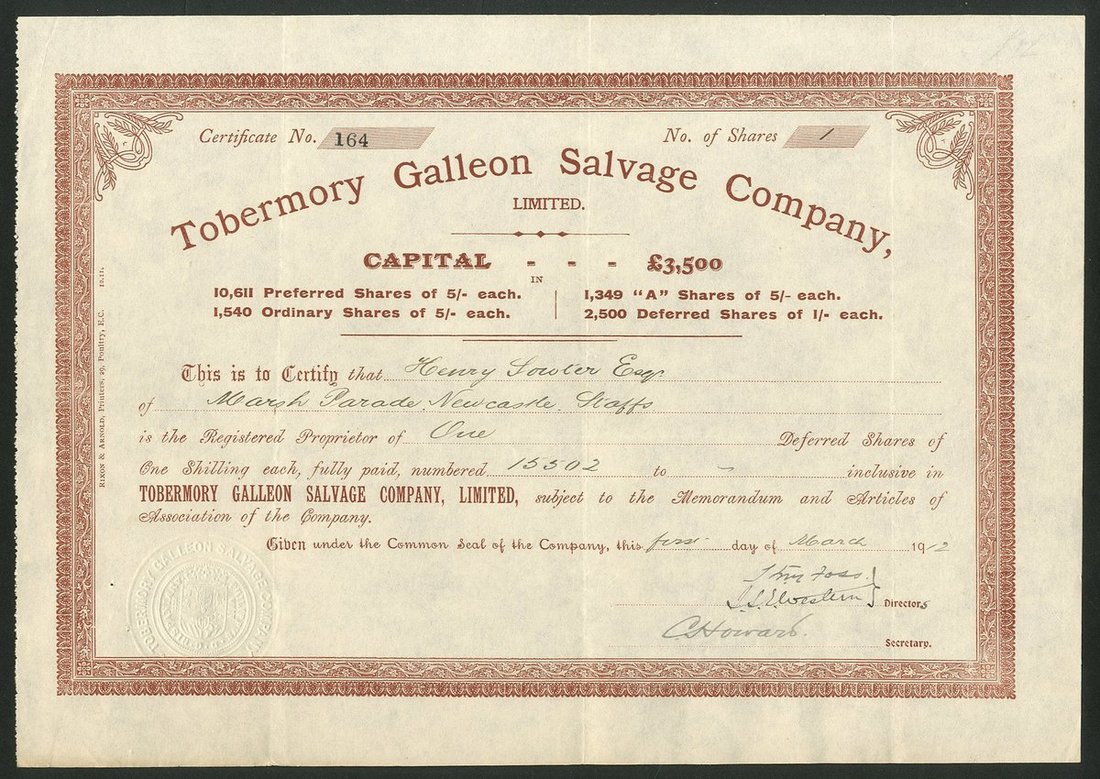 Great Britain: Tobermory Galleon Salvage Company Limited, 1 shilling deferred shares, 19[12], #164, signed by Colonel Kenneth Mackenzie Foss as director, ornate border, brown, embossed seal depicts 8 escudos coin of Philip II of Spain. Formed to salvage the wreck of the Spanish Armada galleon 'San Juan De Sicilia' which sunk off the coast of Tobermory in 1588. VF and rare. First time at auction.