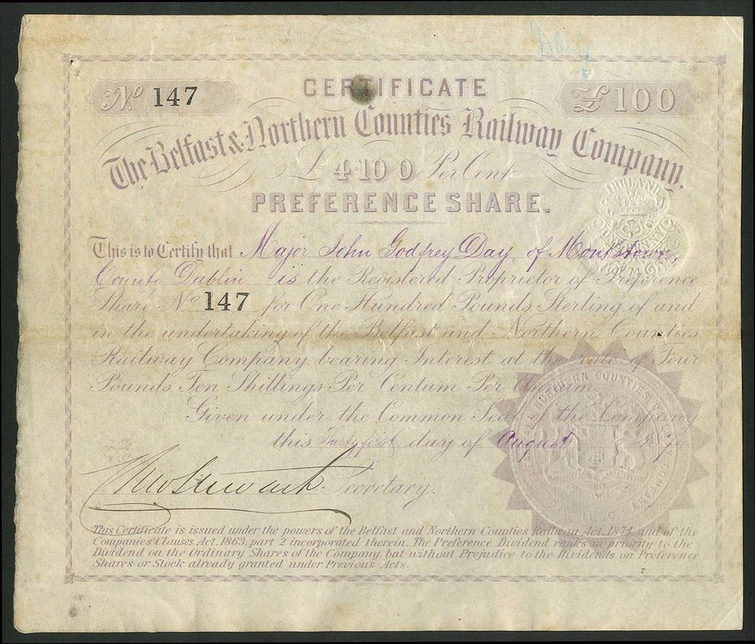 Ireland : Belfast & Northern Counties Railway Company, 4½% preference share for £100, 18[74], #147, mauve, embossed revenue stamp and embossed seal. VF.