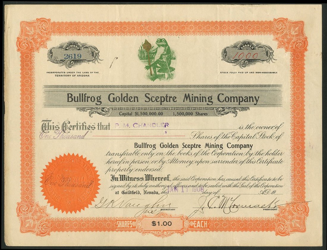 U.S.A.: Bullfrog Golden Sceptre Mining Company, Arizona, $1 shares, Goldfield, Nevada 19[08], #2619, green frog sitting cross legged holding golden sceptre, orange border, black text. GVF.