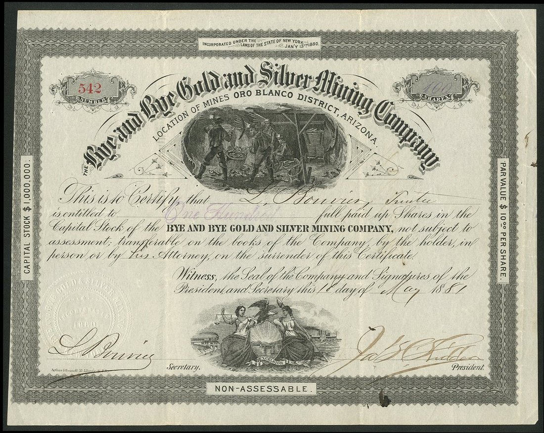 U.S.A.: Bye and Bye Gold and Silver Mining Company, New York, $10 shares, 18[81], #542, miners at work in centre, State arms below, black. Mines in the Oro Blanco District, Arizona. Some light ink smudging but VF and scarce.