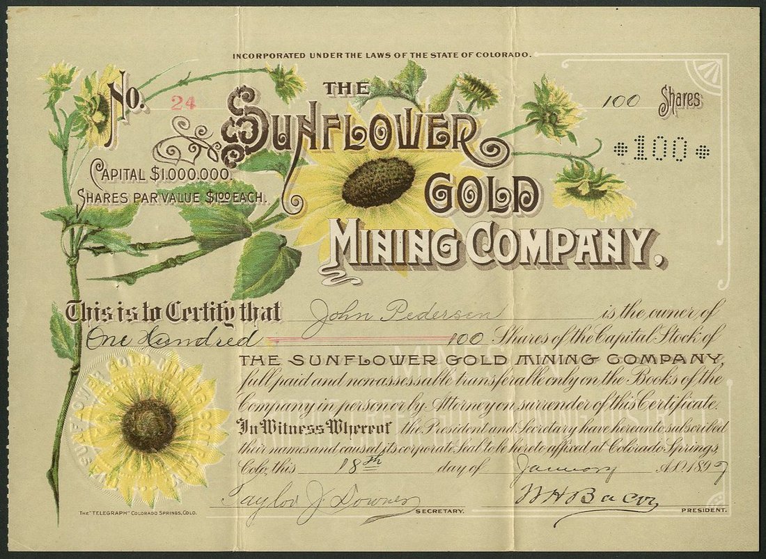 (x) U.S.A.: Sunflower Gold Mining Company, Colorado, $1 shares, 189[7], #24, unique vignette of sunflowers and foliage, green, yellow and brown with buff underprint, tri-folded. GVF.
