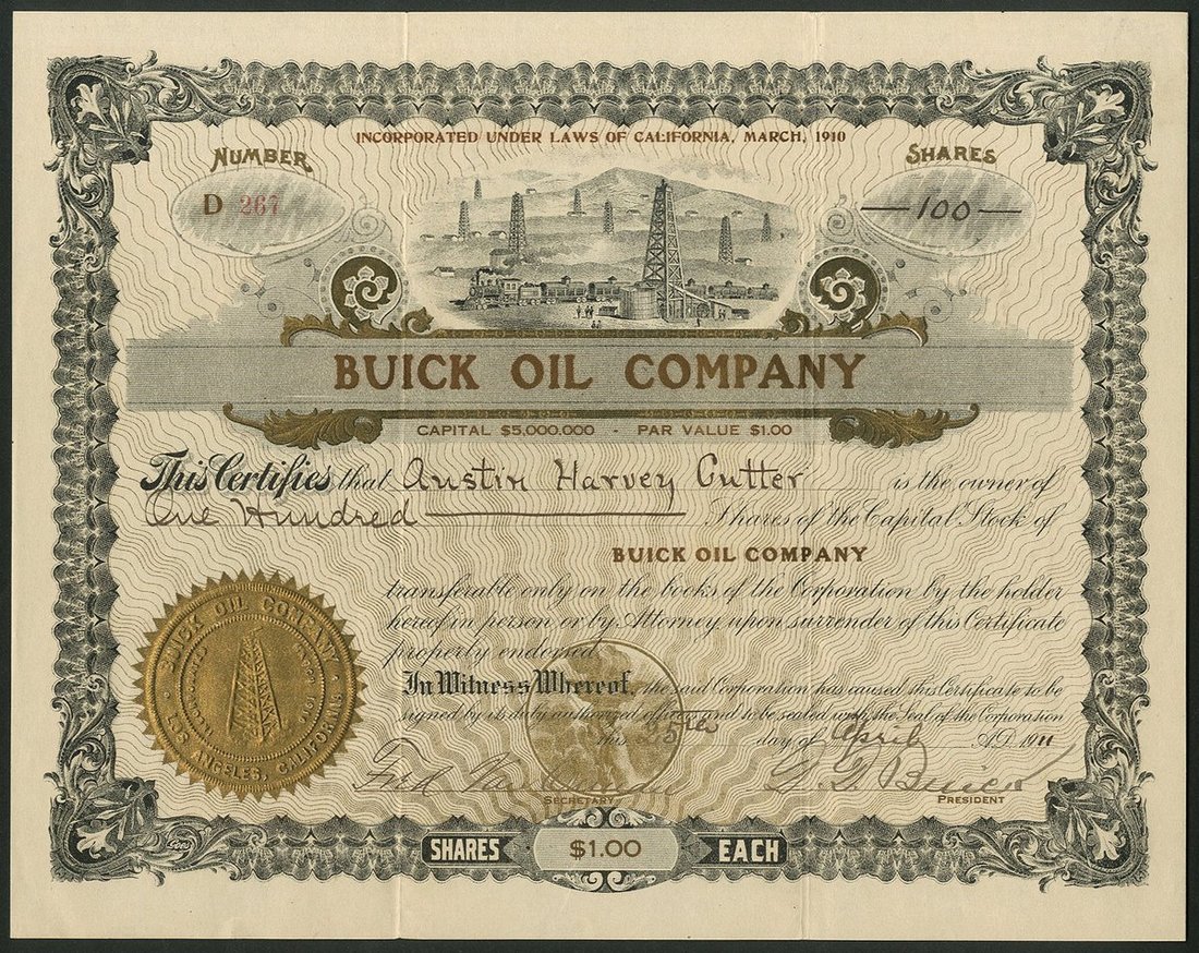 (x) U.S.A.: Buick Oil Company, $1 shares, 19[11], #D267, oilfield at top, ornate border, black with gold underprint, embossed seal, signed by David Dunbar Buick as President. Buick was a Scottish born Detroit based inventor best known for founding the Buick Motor Co. GVF.