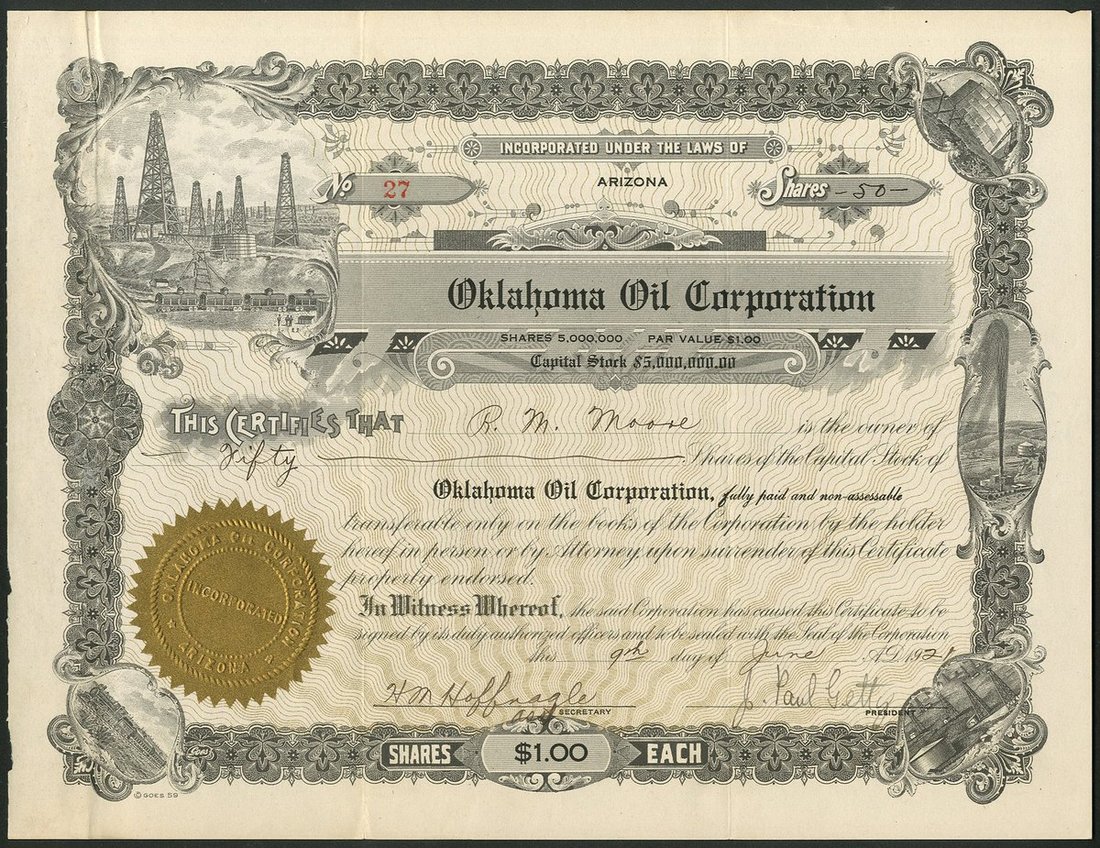 (x) U.S.A.: Oklahoma Oil Corporation, $1 shares, 19[21], #27, oilfield top left, decorative border, black with gold underprint, embossed seal, signed by J. Paul Getty as President. Getty (1892 - 1976), made a fortune in the oil industry with his father and later founded the Getty Oil Company. Named as the richest living American in 1957 and in 1966 became the world's richest man. An avid art collector he established the J. Paul Getty Museum in Los Angeles. Left $6 billion on his death. Very small nick to top right, otherwise GVF.