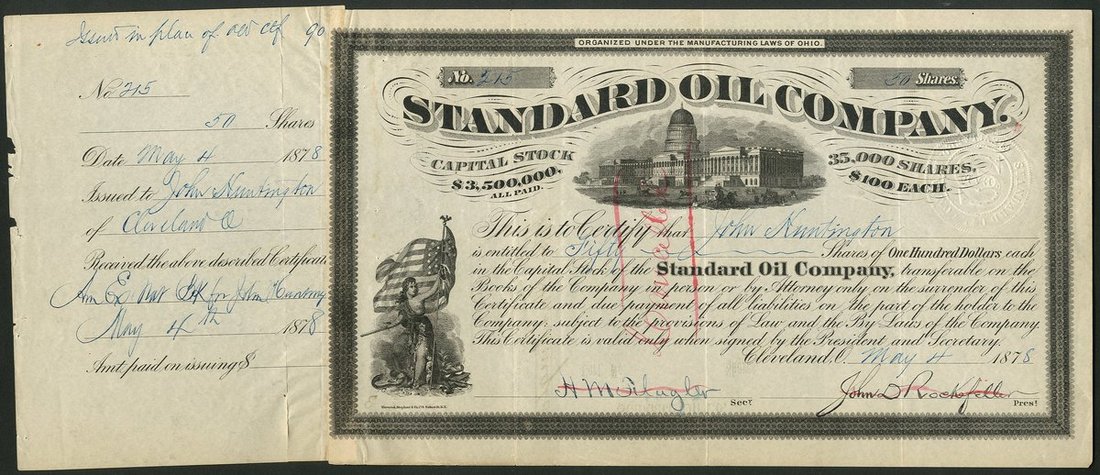 (x) U.S.A.: Standard Oil Company, $100 shares, 187[8], #215, signed by John D. Rockefeller as President, issued to and signed by John Huntington, signed by H M Flagler as Secretary. Vignette of the Capitol Building at top, black, cancelled. Established by J D Rockefeller and Henry Flagler in 1870, with William Rockefeller as an executive, Standard Oil was the largest oil refiner of its time, and formed a monopoly within the industry that lasted until 1911 when the trust dissolved into smaller companies, making Rockefeller the richest man in history. Pin holes left, GVF.
