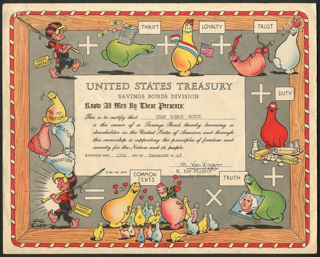 (x) U.S.A.: United States Treasury, Savings Bond Division, certificate given to a young investor as a souvenir of their purchase of a savings bond, 19[49], issued to to Jean Merle Novik, signed by Minette Ker Higgins as Deputy Director (Based in the San Francisco office), attractive design with Al Capp's character Shmoo in various colours. A few folds, VF.