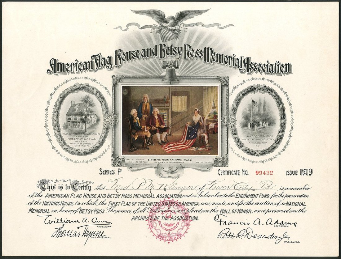 (x) U.S.A.: American Flag House and Betsy Ross Memorial Association, a membership certificate, series P, #99432, issue 1919, full colour vignette in centre of Betsy Ross showing the new flag to her husband, George Washington and Robert Morris. EF.