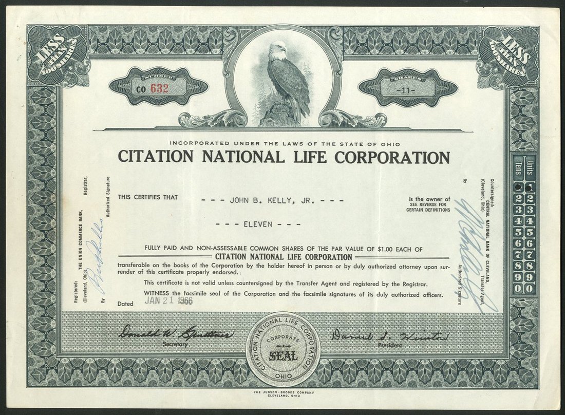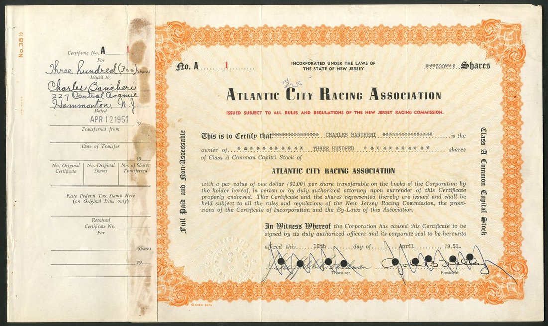 (x) U.S.A.: Atlantic City Racing Association, $1 shares, 19[51], number 1, signed by John B. Kelly Sr. as President, orange and black, cancelled, stub reattached at left. The racetrack was opened by Kelly in 1946 supported by many stars of the day such as Frank Sinatra and Bob Hope. John Brendan Kelly Senior (1889 - 1960), Olympic rower, winning 3 gold medals in 1920 and 1924. Father of Grace Kelly, Princess of Monaco. Together with a certificate issued to John B. Kelly Jr., in Citation National Life Corporation, 1966. VF (2).