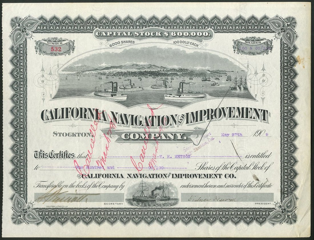 (x) U.S.A.: California Navigation and Improvement Co., $100 shares, 190[9], #532, large shipping scene at top and ornate border, black, cancelled. Formed in 1854 to establish shipping routes in San Francisco Bay and on the Sacramento and San Jacinto Rivers. Small mark on right edge, VF.