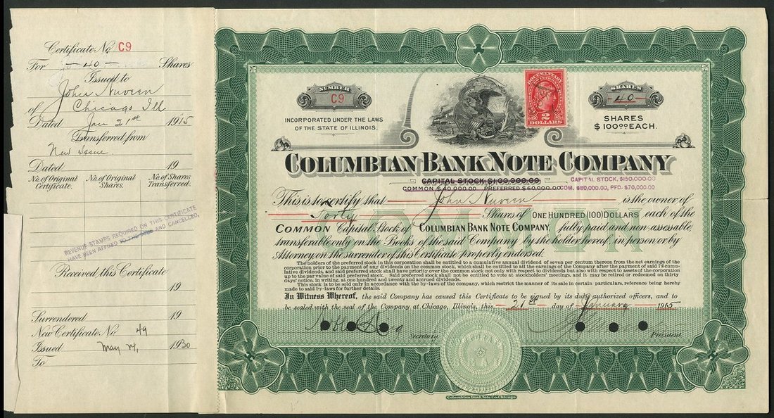 (x) U.S.A.: Columbian Bank Note Company, $100 shares, common stock, 19[15], #C9, issued to John Nuvean and signed by him on the reverse and again on an attached receipt. Also signed on the reverse by John Nuvean Jr. as a witness to his fathers signature. Eagle vignette, green and black, cancelled, stub reattached at left. The John Nuvean Company was founded in 1898 as investment bankers. Exists today as Nuvean Investments managing nearly $1 trillion of assets. John Nuvean Jr. helped with the Marshall Plan following WWII. VF.
