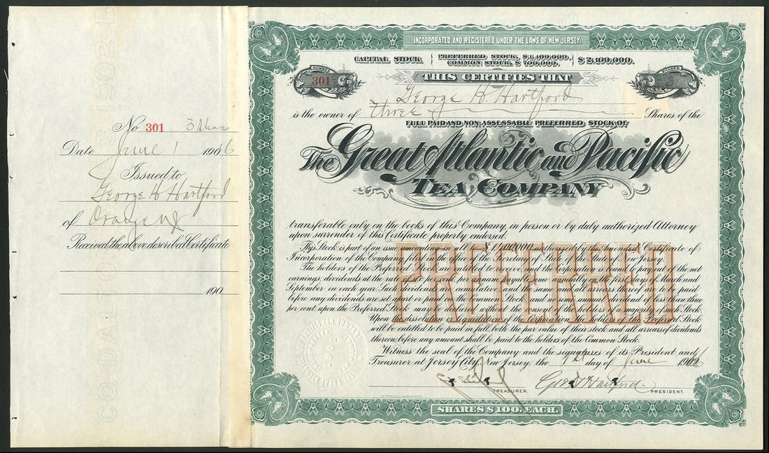 (x) U.S.A.: Great Atlantic and Pacific Tea Company, preferred stock, 1916 over 1902, #301, issued to George H Hartford and signed by him both as President and on the reverse as transferor, green and black, brown underprint, cancelled with stub reattached at left. George Huntington Hartford, 1833 - 1917, was the head of the business from 1878 to 1917 creating a retail chain store that became the largest in the USA. Its 16000 stores in 1930 created a revenue of over $1 billion, the first retailer to do so. EF and rare.