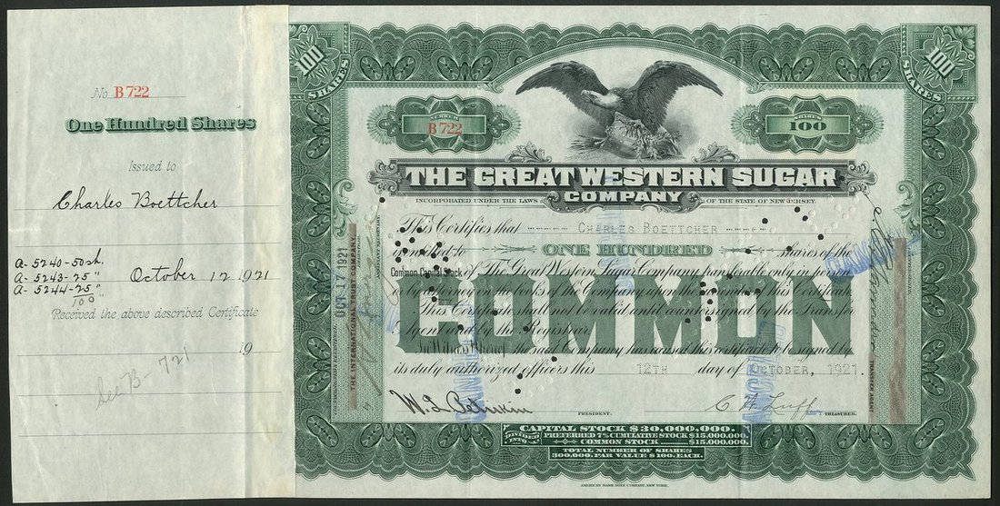 (x) U.S.A.: Great Western Sugar Co., 100 common shares, [1921], #B722, Eagle at top, ornate border, green and black, cancelled. Issued to and signed on reverse by Charles Boettcher (1852-1948), German born businessman who started out running hardware stores, but went on to organise companies such as the Ideal Cement Co., and the Great Western Sugar Co. GVF.