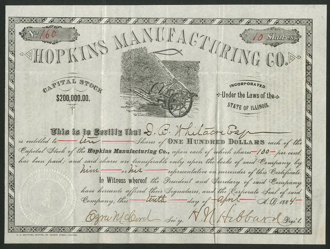 U.S.A.: Hopkins Manufacturing Co., Illinois, $100 shares, 188[4], #160, plough in centre, black. Chicago based company making agricutural equipment but best known for their mowing machines. VF.