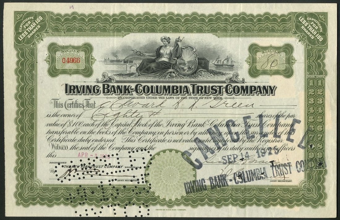 (x) U.S.A.: Irving Bank-Columbia Trust Company, certificate for less than 100 shares, [1923], #O4966, issued to Edward H. R. Green and signed by him on the reverse, allegorical figure at top, green and black, cancelled. Edward Howland Robinson Green, 1868 - 1936, businessman and only son of Wall Street investor, Hetty Green. Inherited half of his mother's estate in 1916 and became a noted collector of both coins and stamps. Built a mansion at Round Hill, Massachusetts which was later used as headquarters of the Round Hills Radio Corporation of which Green was president. VF.