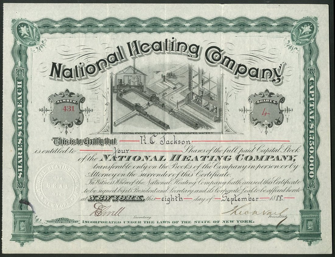 (x) U.S.A.: National Heating Company, $100 shares, 18[88], #431, signed by Theodore Vail as President, lovely vignette of heating system, green and black. Not cancelled. Theodore Vail (1845-1920), first President of American Telephone & Telegraph between 1885 and 1889 and again from 1907 to 1919 utilising his position to consolidate telephone networks using the Bell System. On his death in 1920 all telephone services were suspended throughout the USA for 1 minute during his funeral. VF.