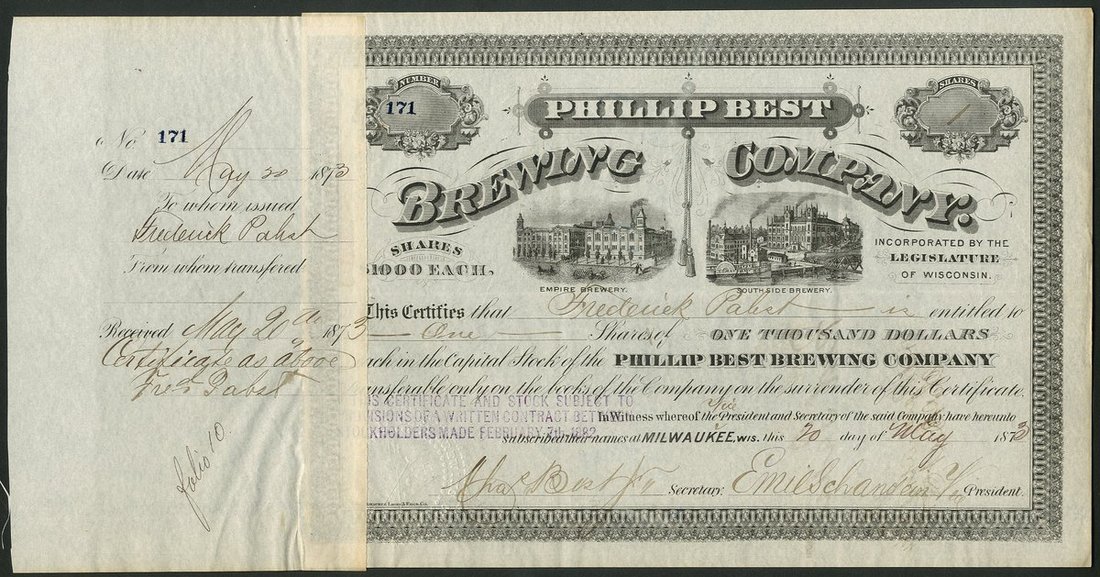 (x) U.S.A.: Phillip Best Brewing Company, Wisconsin, $1000 share, 187[3], #171, issued to Frederick Pabst and signed by him both on the reverse and on the stub which is reattached at the left. Also signed by Charles Best Jr. as secretary and Emil Schandein as Vice President. Vignettes of the Empire and South Side Breweries in Milwaukee, black. Frederick Pabst (1836-1904), a German-American met Phillip Best whilst captaining a small steamer on Lake Michigan. Pabst married Best's daughter Maria in 1862 and 2 years later was taken into partnership in the Phillip Best Brewery, becoming President in 1873. Schandein married Best's other daughter and was sold the other half of the business. He died in 1894. The company name was later changed to Pabst Brewing Company. It became the first Brewer in American to sell more than 1 million barrels in a year. VF.