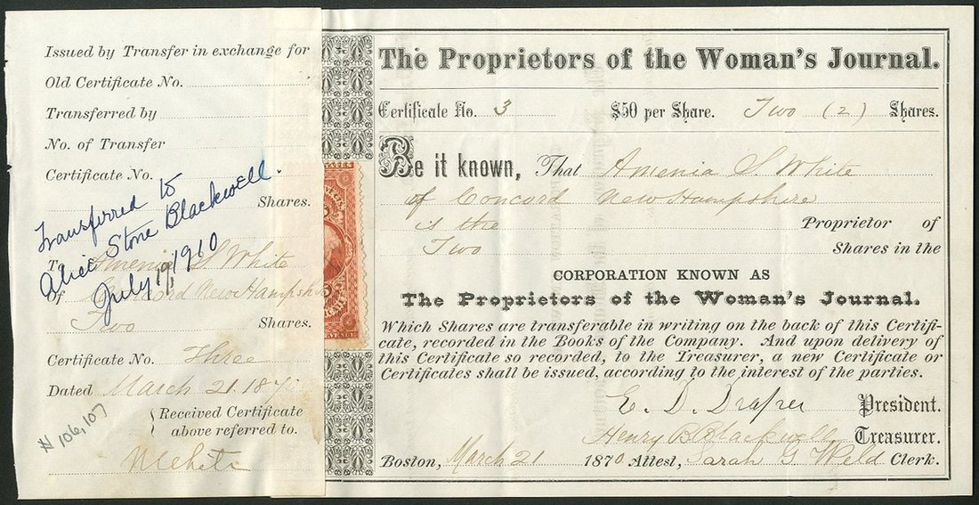 (x) U.S.A.: Proprietors of the Woman's Journal, $50 shares, Boston 187[0], #3, signed by Henry B. Blackwell as treasurer, plain black printing, stub reattached at left. Henry Browne Blackwell (1825 - 1909), a social and economic reformer. One of the founders of the Republican party and the American Woman Suffrage Association. He was publisher of this journal from 1870 with Lucy Stone, a fellow abolitionist and suffragist, later to become his wife. The stub notes the shares were transferred to their daughter Alice Stone Blackwell. GVF.