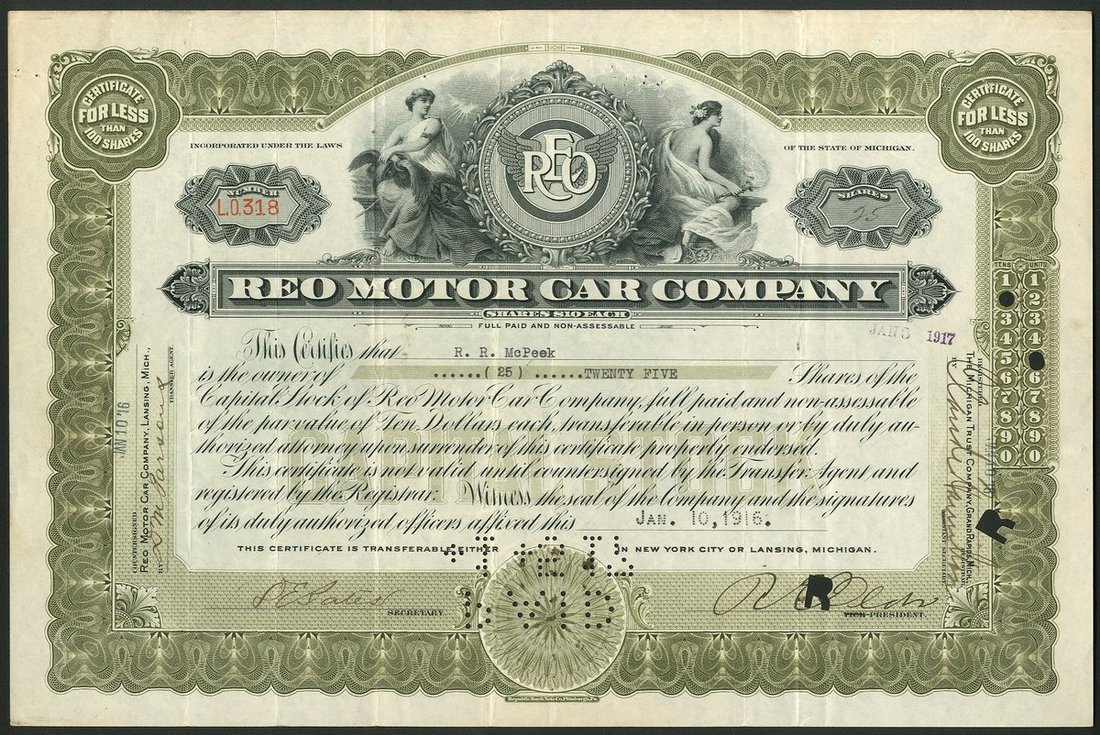 (x) U.S.A.: Reo Motor Car Company, less than 100 shares capital stock, [1916], #L0318, company logo with figures above title, ornate border, olive green and black, cancelled. Signed by Ransom Eli Olds (1864-1950) as President. Olds founded the REO brand in 1905 after leaving Oldsmobile, the company producing automobiles, trucks and even buses. GVF.
