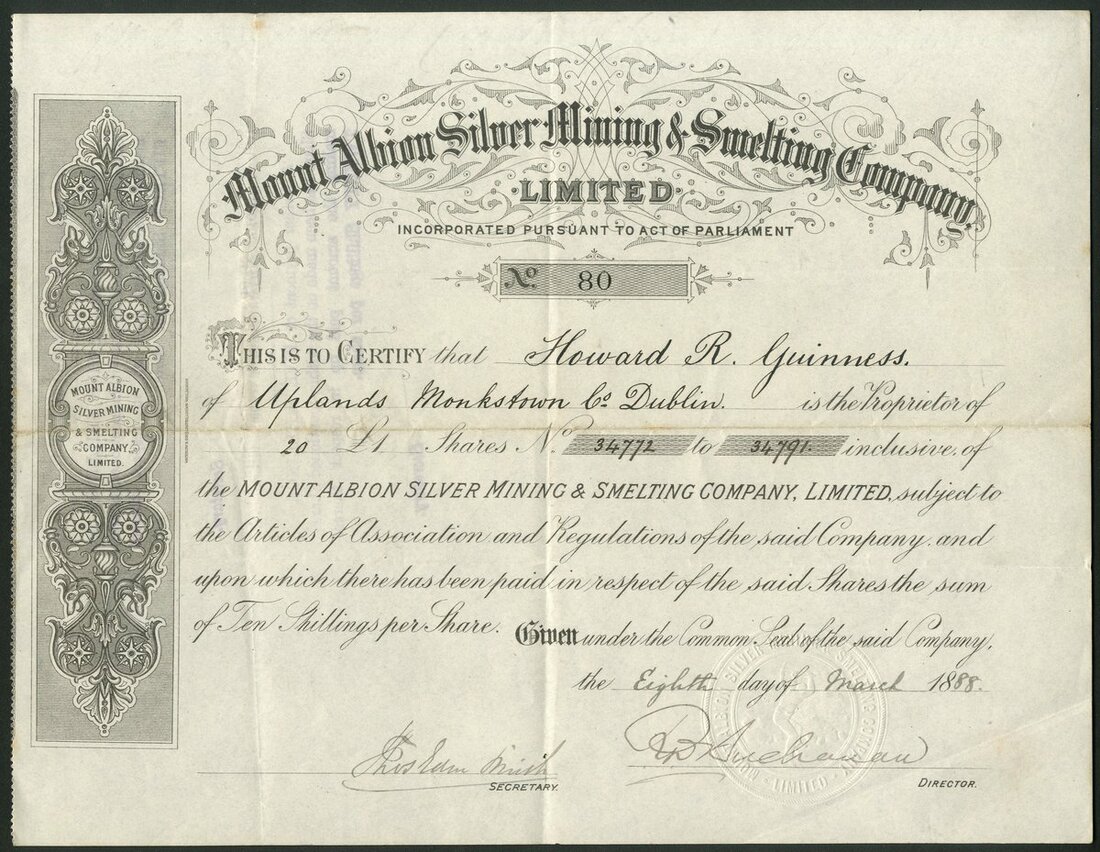 Australia: Mount Albion Silver Mining & Smelting Co. Ltd., £1 shares, 18[88], #80, scrollwork at left, black, printed by Waterlow & Sons. Registered 28th November 1887 to acquire the Mount Albion, Silver Hill and Orient Groups of silver mines in the district of Herberton, North Queensland. VF and scarce.