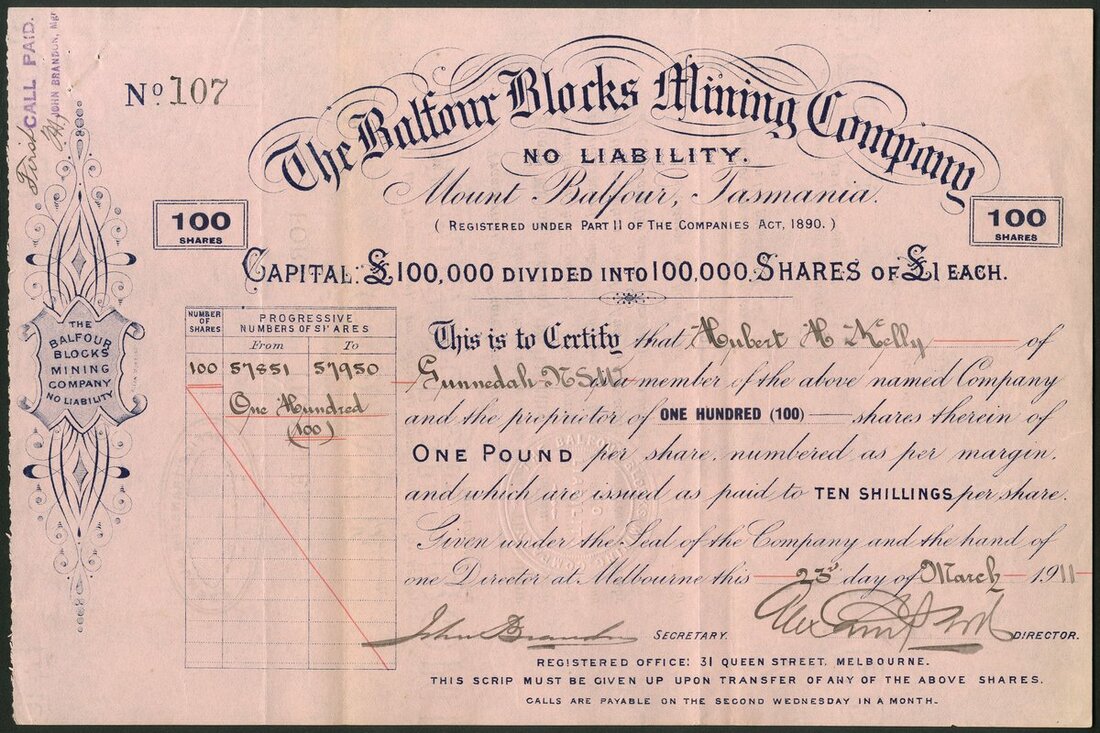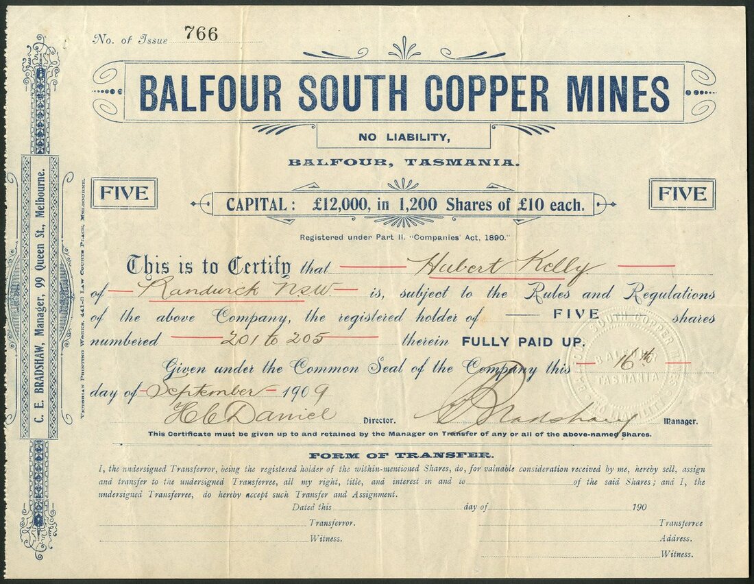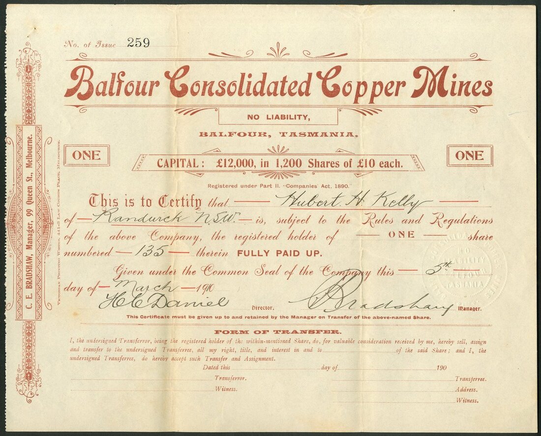Australia: A trio of copper mines located at Balfour, Tasmania, comprising Balfour Blocks Mining Company NL, 100 shares of 10s, 19[11], #107, black on pink paper; Balfour Consolidated Copper Mines NL, one share of £10, 190[10], #259, brown, and Balfour South Copper Mines NL, 5 shares of £10, 190[9], #766, blue. Generally VF (3).