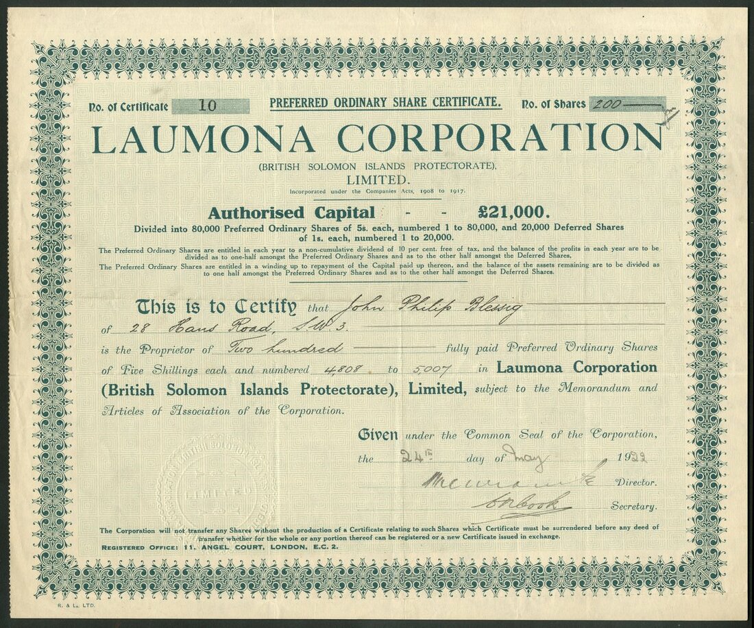 British Solomon Islands: Laumona Corporation (British Solomon Islands Protectorate) Ltd., 5/- preferred ordinary shares, 19[22], #10, ornate border, green. An English company in this very rare location on which we unfortunately cannot find any information. VF.