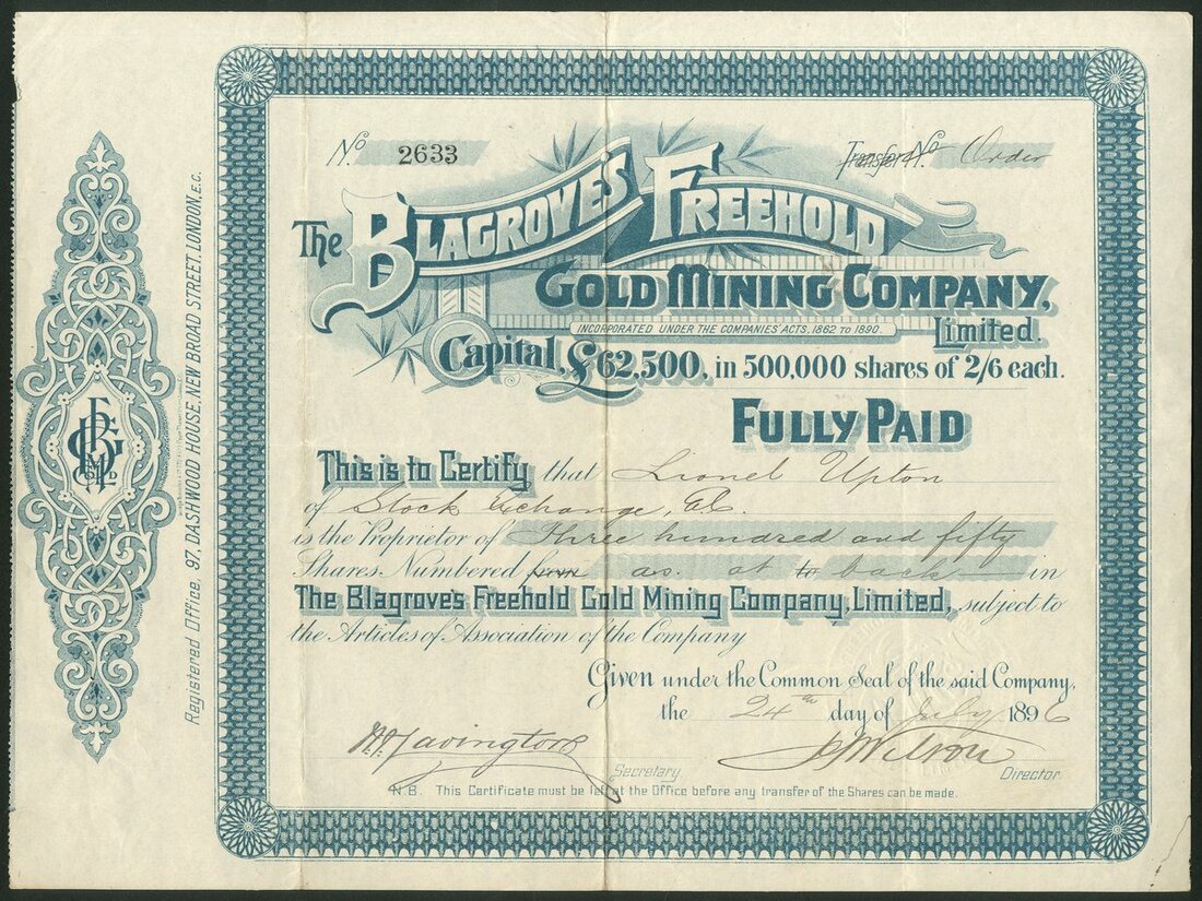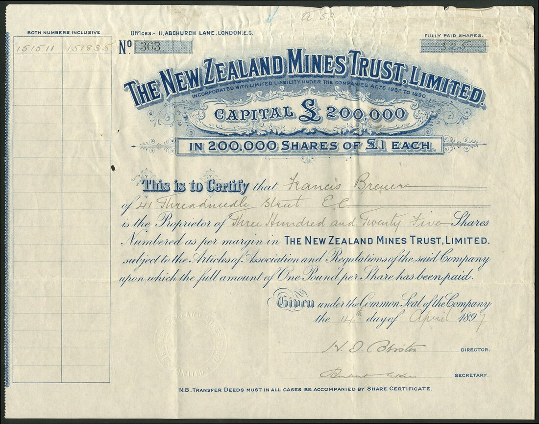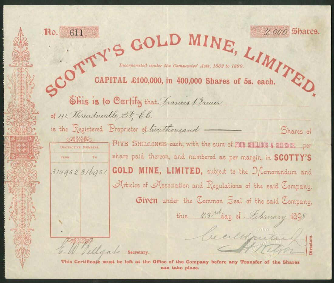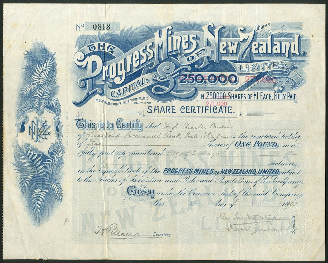 New Zealand & Australia: Scotty's Gold Mines Ltd., 5/- shares, part paid, 189[8], #611, scrollwork at left, red. Together with other New Zealand mines comprising Blagroves Freehold Gold Mining Co. Ltd., 2/6d shares, fully paid, 189[6], #2633, blue; Progress Mines of New Zealand Ltd., £1 shares, fully paid, 18[1901], #0893, blue, capital increase overprinted in red, and, New Zealand Mines Trust Ltd., £1 shares, fully paid, 189[7], blue, #363, blue, and Australasian Incandescent Gas Light Co. Ltd., bearer warrant for 5 shares of £1, London 189[5], B1054, overprinted 'Welsbach Light Company of Australasia Ltd., Formerly', ornate border, green, text in English and French, printed by Waterlow & Sons, with coupons. Founded by Carl Auer von Welsbach, a German chemist, who had invented the gas mantle and metal filaments for light bulbs. Companies had been set up in several countries and those in British or Colonial territories were declared an enemy in 1914 at the outbreak of WWI. Mostly VF (5).