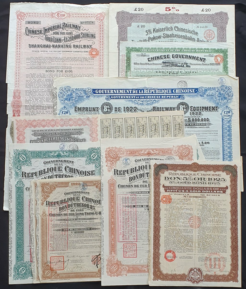 (x) China: A small collection comprising, Shanghai Nanking Railway, £100, 1904; Tientsin Pukow Railway, 1908, £20, German issue; 1919 Vickers Loan, £100; Lung Tsing U Hai Railway, 1920 (no coupons), 1921, 1923 (2 examples) and 1925; 1922 Railway Equipment Loan, £20, and, 1925 Gold 'Boxer' Loan, $50. Generally VF (11),