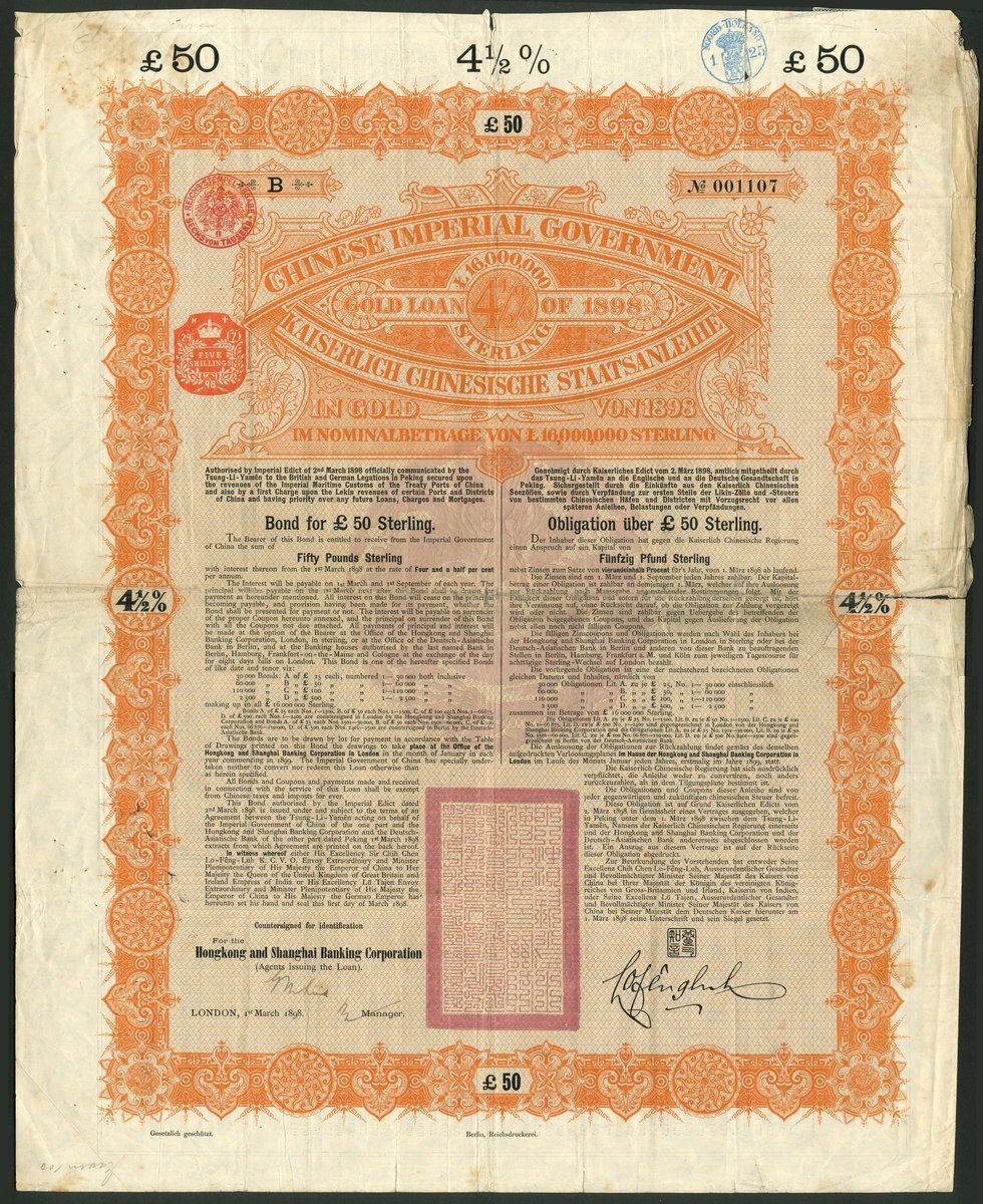 China: 1898, 4½% Gold Loan, £50 bond, #001107, issued by the Hongkong and Shanghai Banking Corporation, large format, ornate border, orange and black, chop in centre, with coupons. Pinholes and tear at right edge, Fine.
