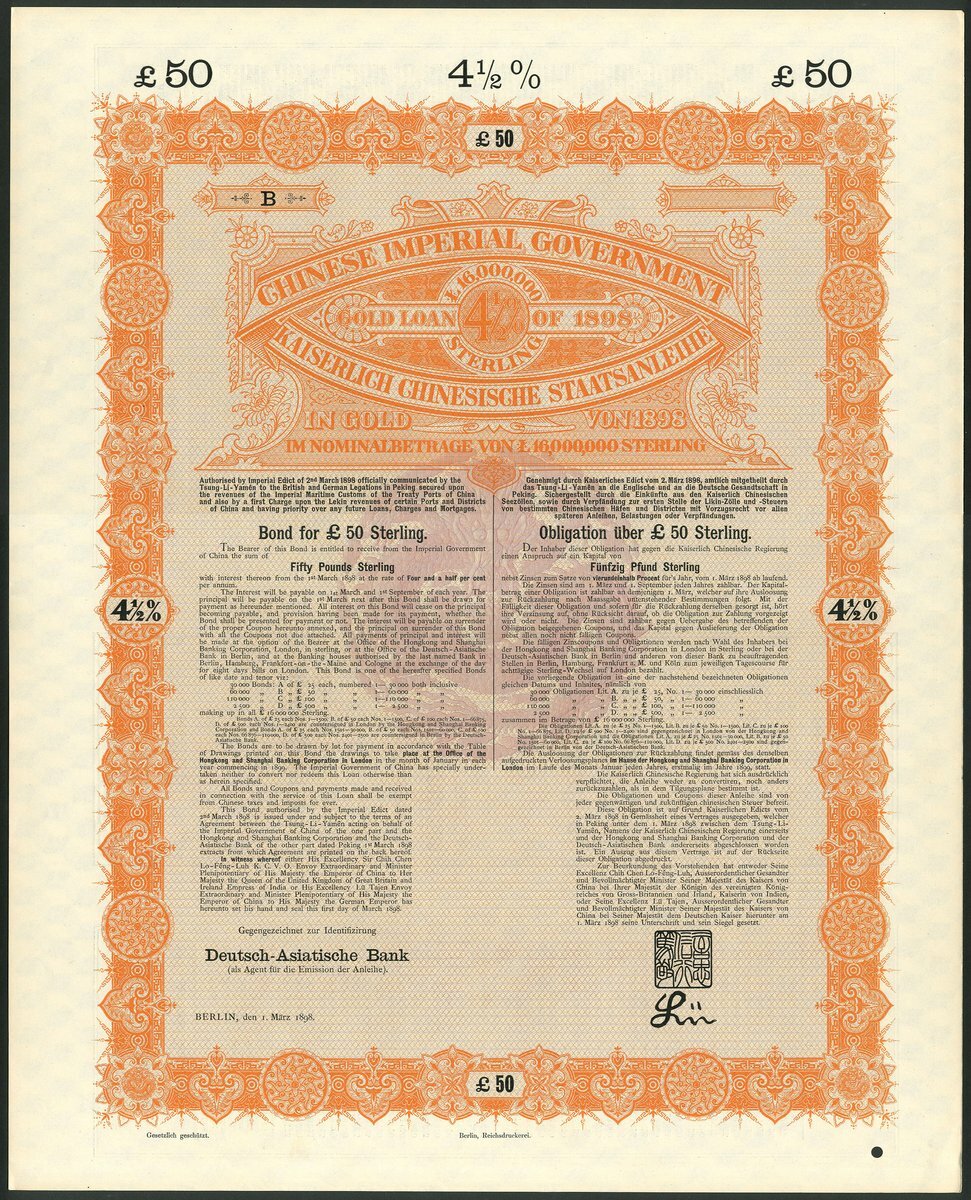 (x) China: 1898 4½% Gold Loan, an unissued reserve stock bond for £50, issued by the Deutsch-Asiatische Bank, large format piece, orange and black, no coupons, small hole cancel. Almost UNC.