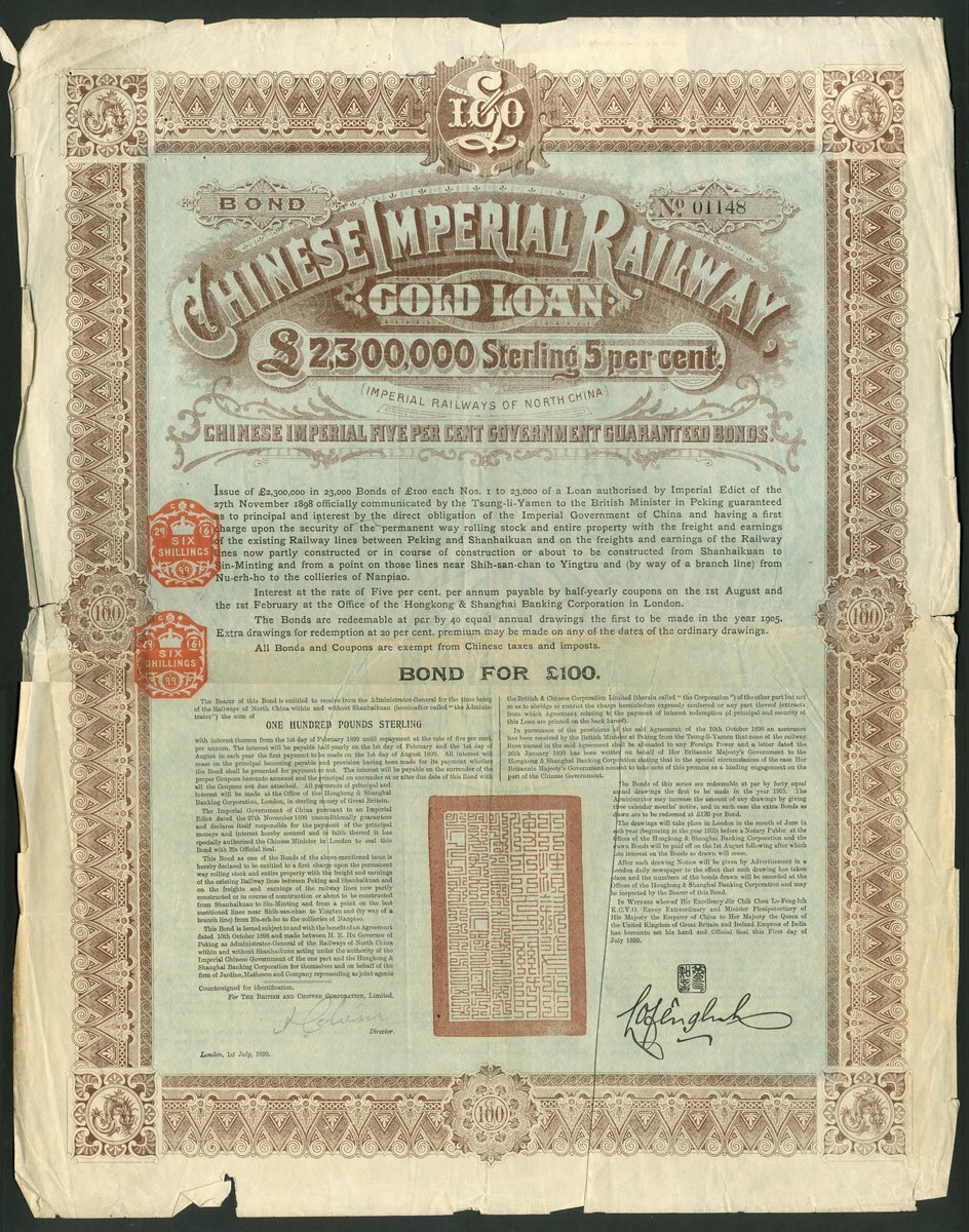 China: 1899 5% Imperial Railway Gold Loan, bond for £100, #01148, large format, ornate border, brown, blue underprint, with coupons. A few edge splits as usual otherwise AVF.