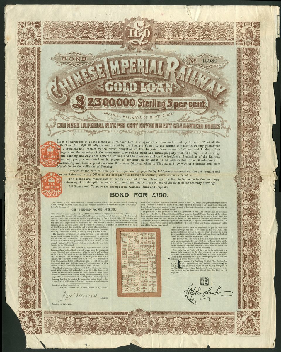 China: 1899 5% Imperial Railway Gold Loan, bond for £100, #15989, large format, ornate border, brown, blue underprint, with coupons. Tear at top edge, spike hole in lower body, otherwise AVF.