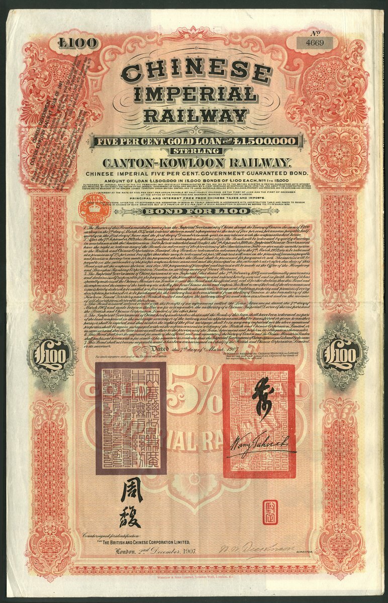 (x) China: 1907 Canton-Kowloon Railway 5% Gold Loan, bond for £100, #4669, large format, red and black, printed by Waterlow, with coupons. VF.