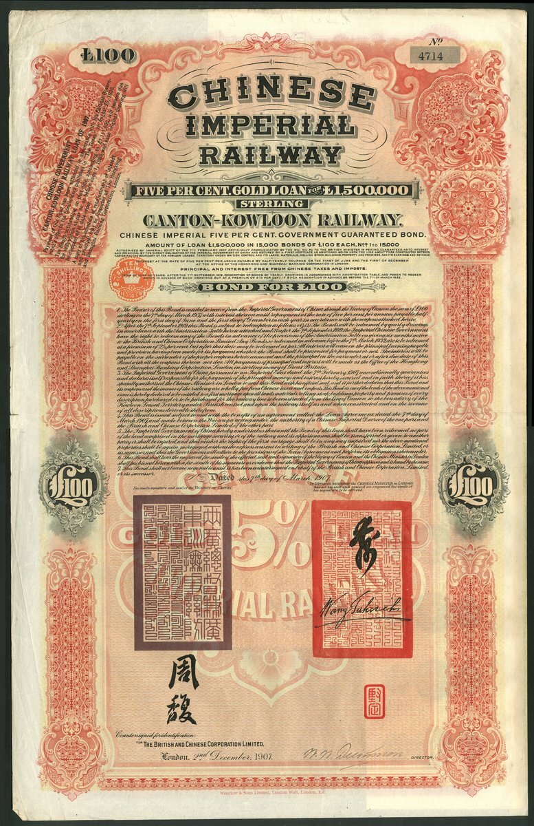 (x) China: 1907 Canton-Kowloon Railway 5% Gold Loan, bond for £100, #4714, large format, red and black, printed by Waterlow, with coupons. VF.