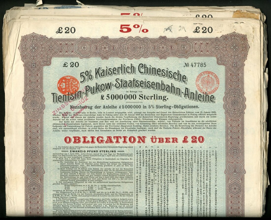 (x) China: 1908 5% Tientsin-Pukow Railway Loan, a group of 25 x £20 bonds, issued by the Deutsch-Asiatische Bank, large format, mauve and black with green underprint, with coupons 61-102 remaining, NOT cancelled. mixed condition by most VF and better (25 examples).