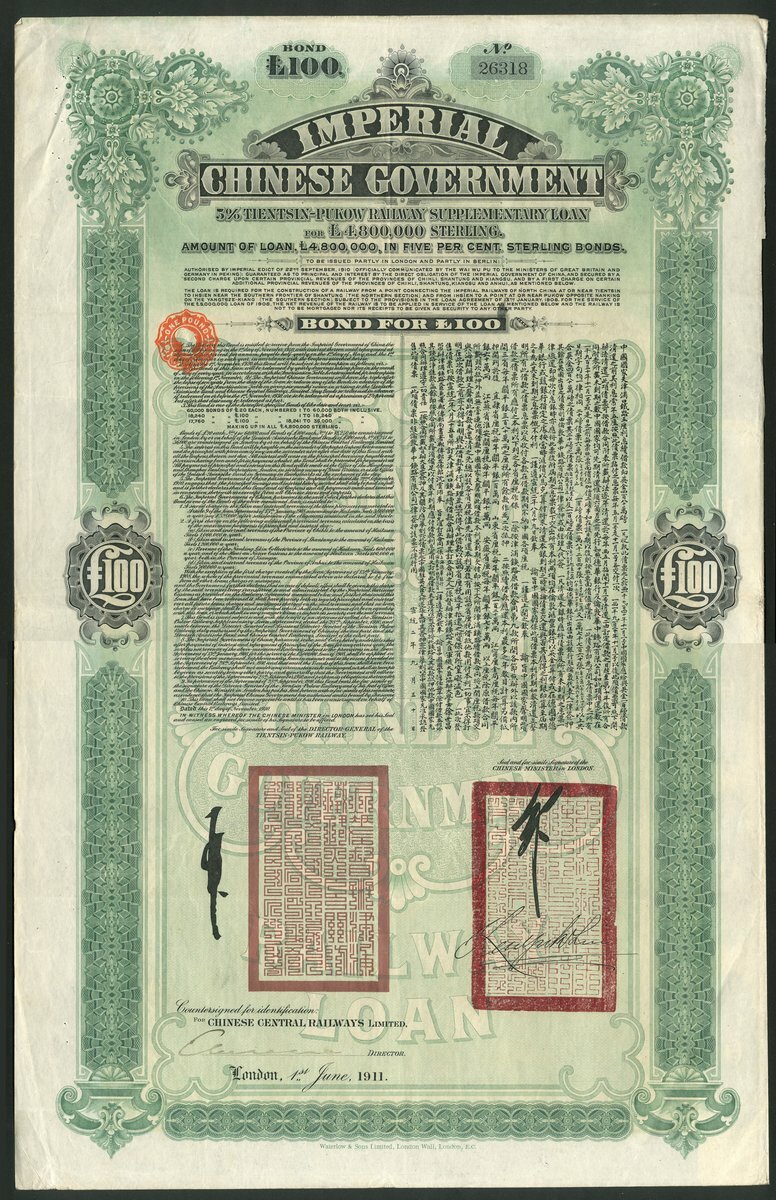 (x) China: 1910 5% Tientsin-Pukow Railway Supplementary Loan, £100 bond, English issue, by Chinese Central Railways Ltd., #26318, large format, green, Waterlow printing, with coupons. VF.