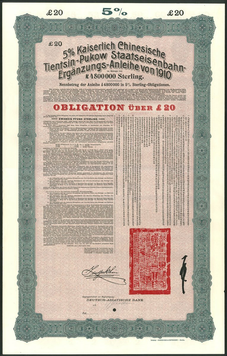 (x) China: 1910 5% Tientsin-Pukow Railway Supplementary Loan, a group of 5 reserve stock £20 bonds, issued by the Deutsch-Asiatische Bank, large format, green and black with mauve underprint, each with full sheet of coupons, no serial numbers, small hole cancellation. Almost UNC (5 examples).