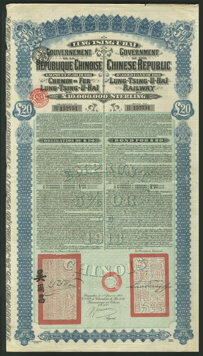 China: 1913 Lung Tsing U Hai Railway Loan, £20 bond, #B152751, large format, ornate border, blue and black, with original coupons 26-80. AVF.