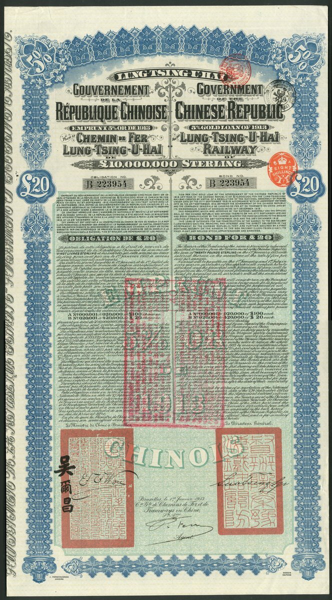 (x) China: 1913 Lung Tsing U Hai Railway Loan, £20 bond, #B223954, large format, ornate border, blue and black, with replacement coupons 83-124. Lovely condition, EF.
