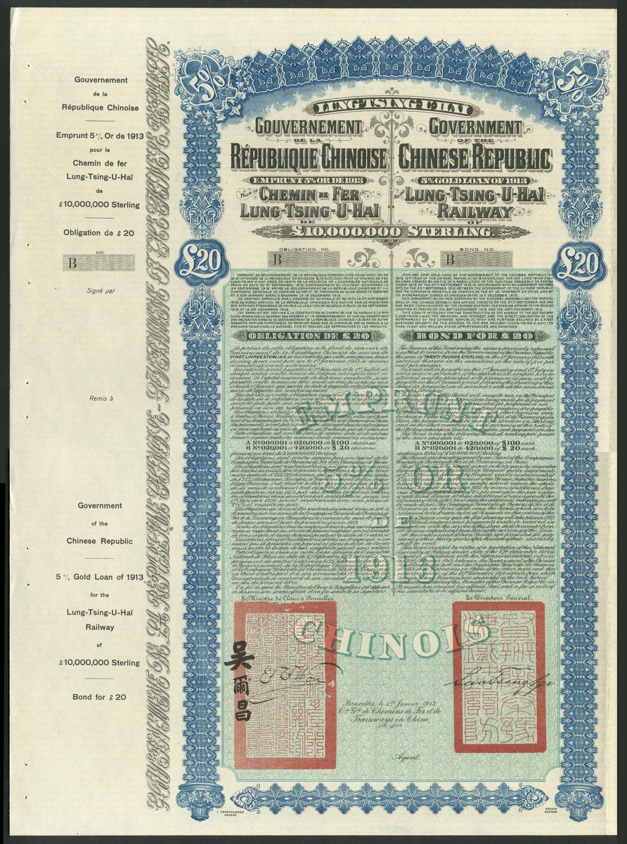China: 1913 Lung Tsing U Hai Railway Loan, £20 bond, unissued reserve stock, large format, ornate border, blue and black, with coupons and counterfoil. GEF.