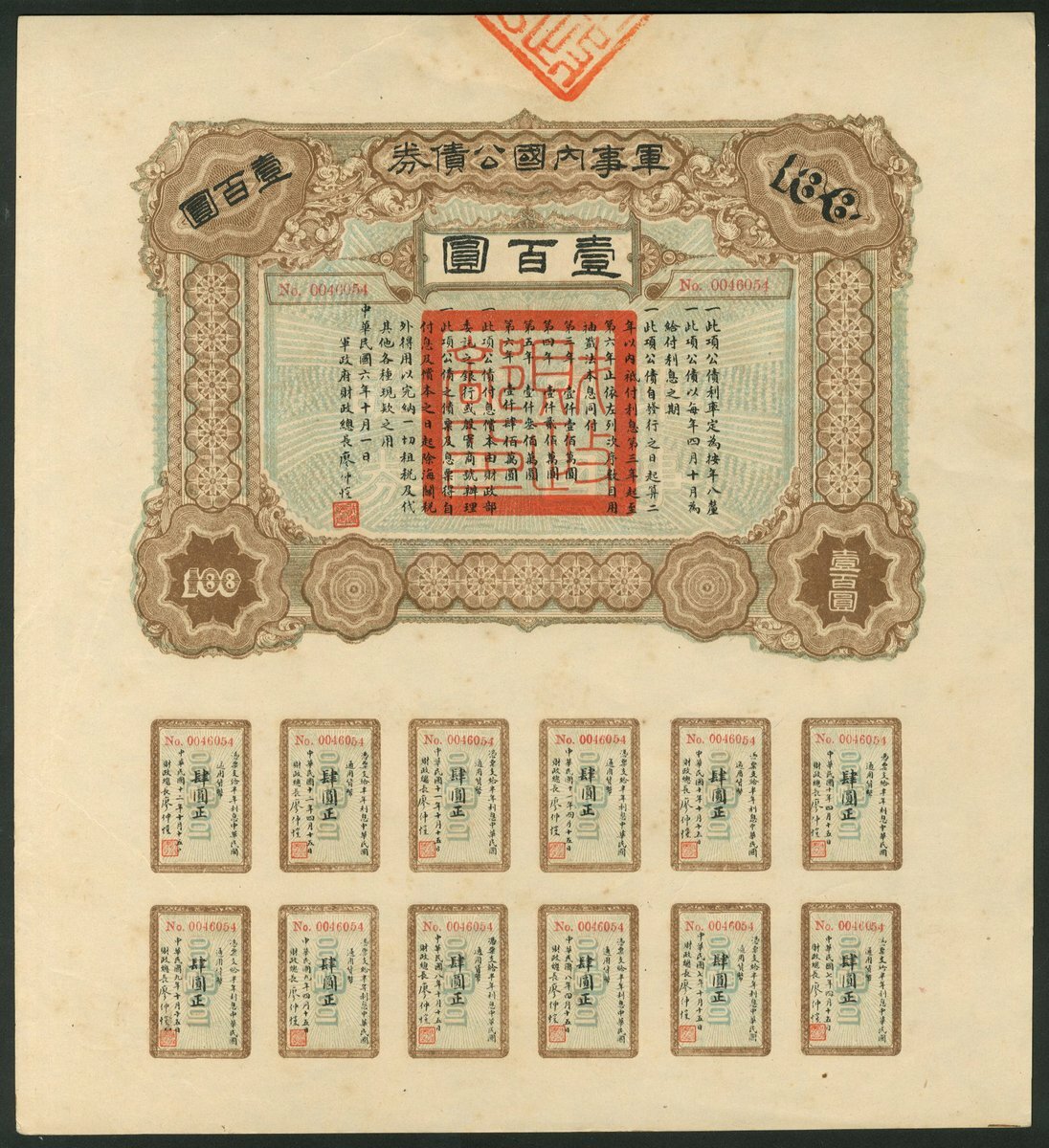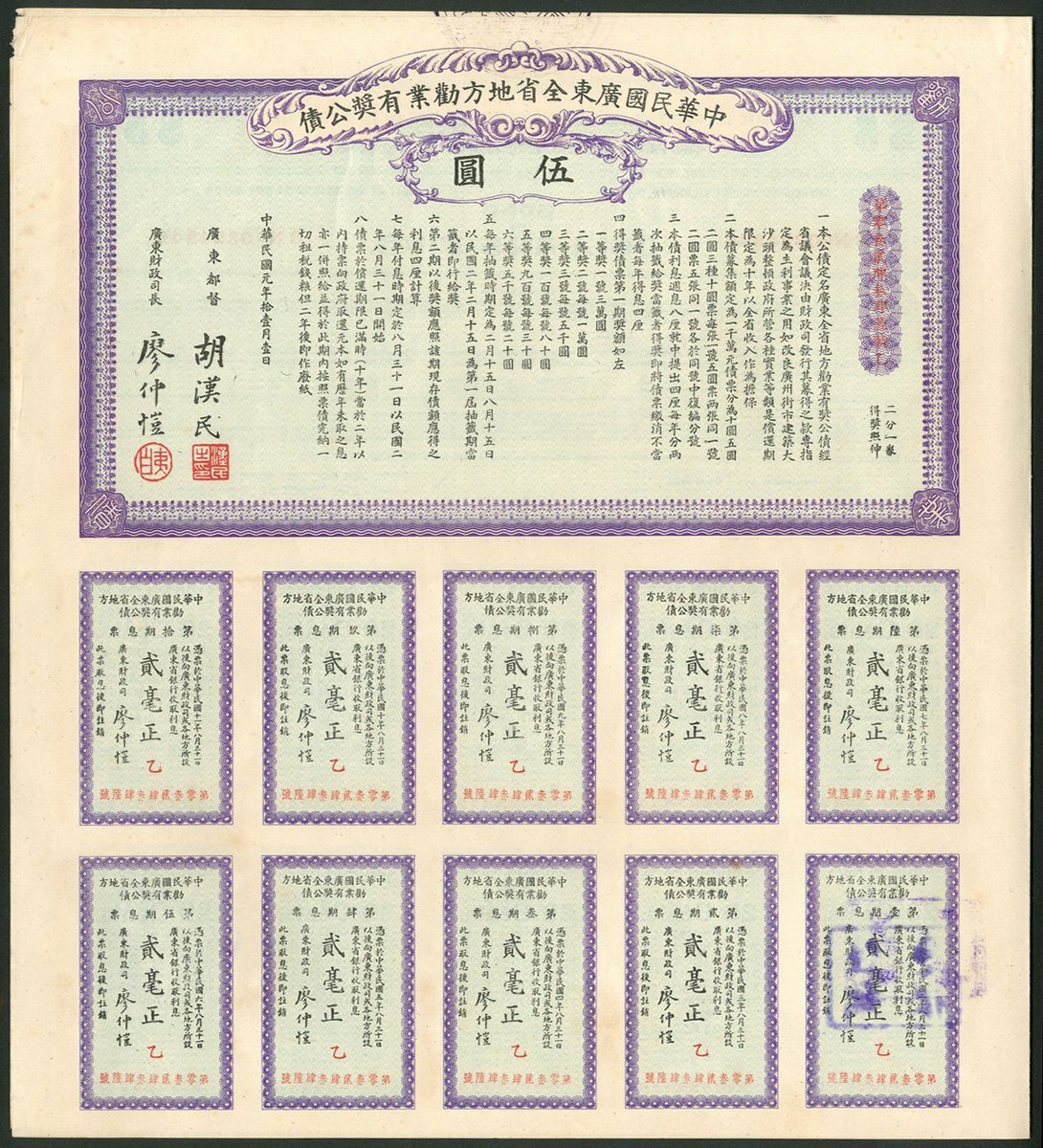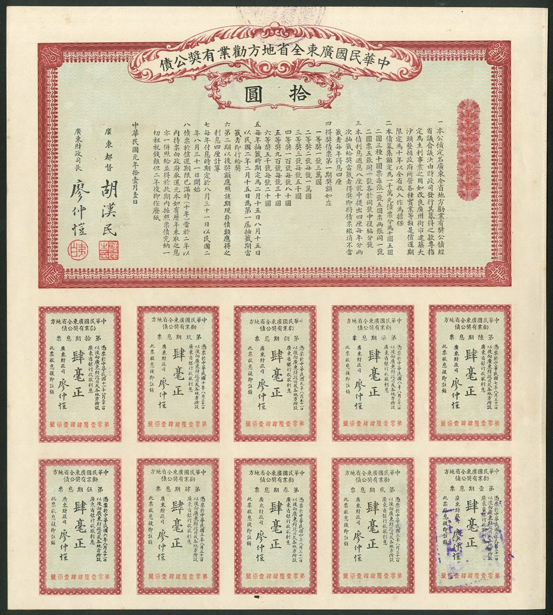 China: 1917 8% Military Loan, 100 yuan bond, brown, green underprint, with coupons, together with Kwangtung Provincial Government, Public Lottery Loan, 1912, bonds for $5 and $10, text in Chinese, English reverse, with coupons. All EF (3).