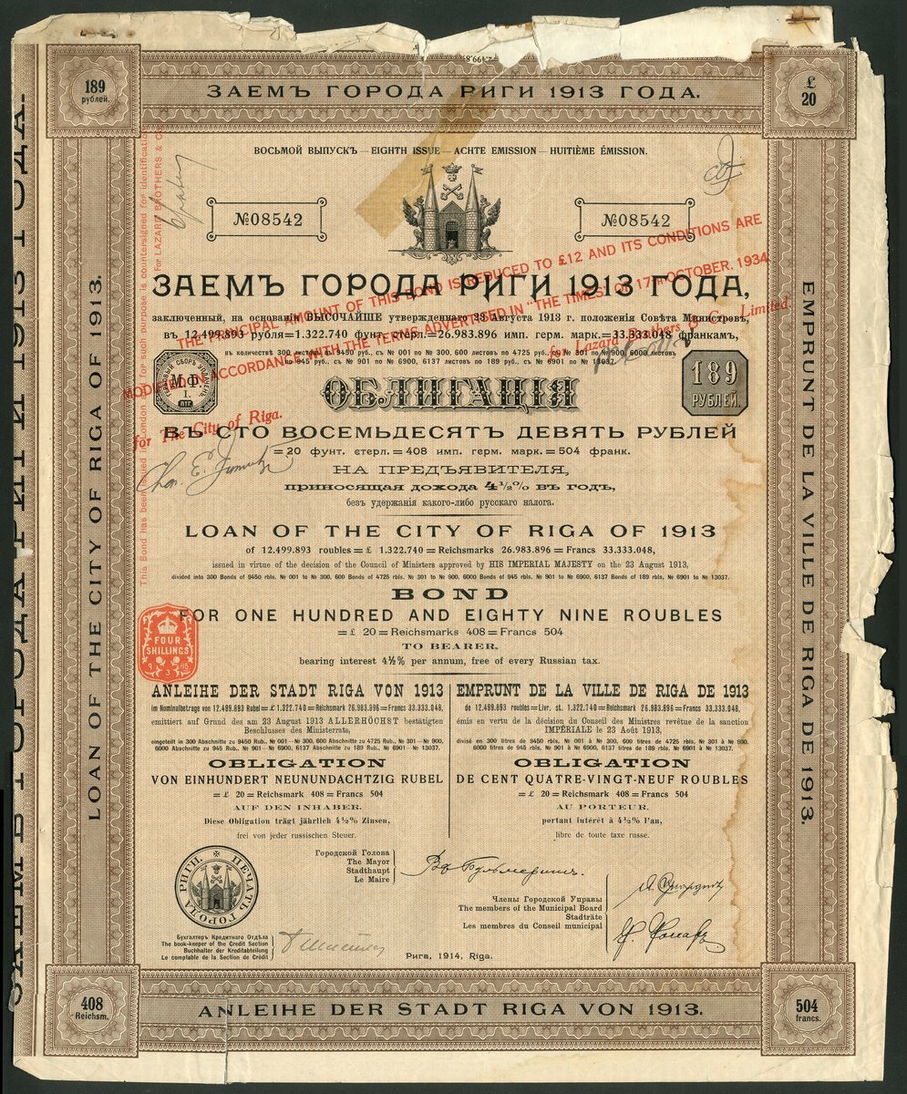 Russia/Latvia: City of Riga, 4½% Loan, 1913, bond for 189 roubles or £20, #8542, dated 1914, arms at top, brown and black, endorsement in red of reduction of nominal value to £60 in 1934, with replacement coupons and with 1959 declaration certificate. Edges a little ragged, with some paper loss at top edge. Old repaired tear at top, F and rare (more difficult to find than the £100 denomination).